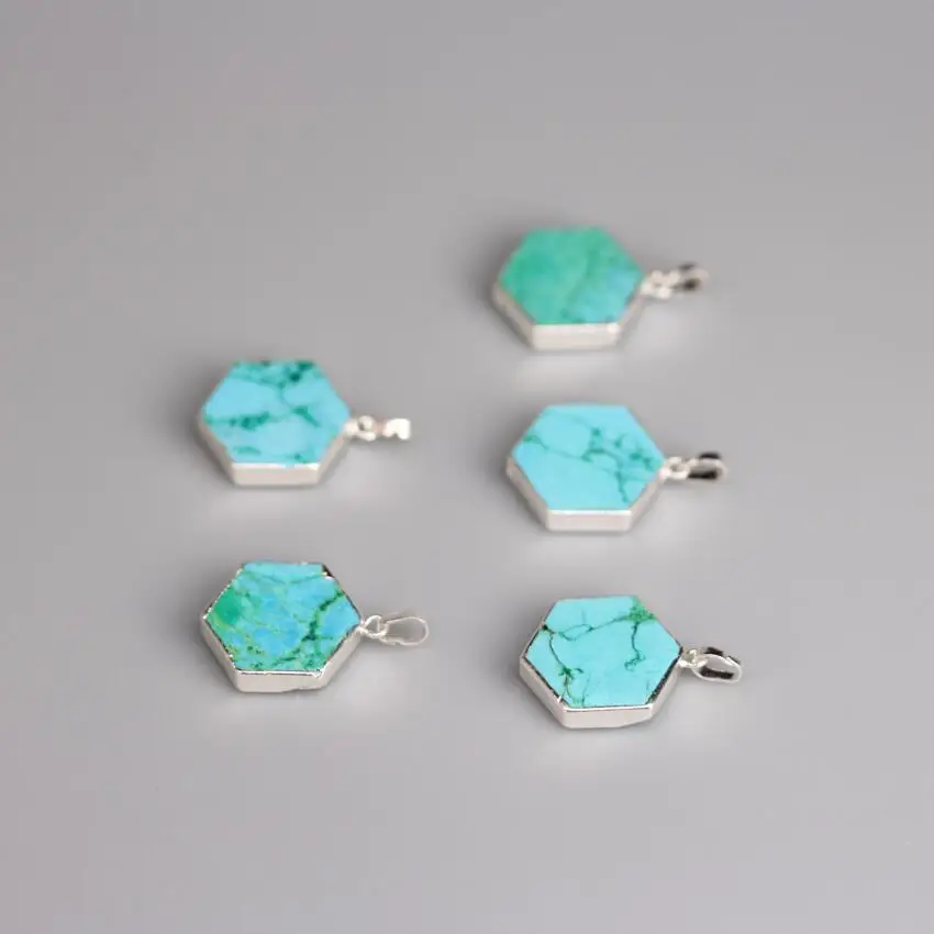 Goede Koop 5 stks partij, Verzilverd Hexagon Slab Charms Ruwe Turkooizen Hangers, Blauw Howliet Slice Nugget Hangers Ketting Sieraden Goedkoop