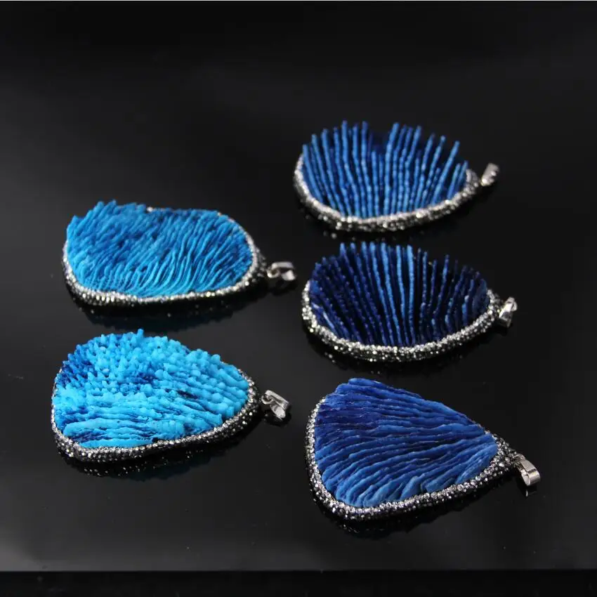 Goede Koop 5 stks, Gecoat Blauw Coral Slab Nugget Hanger, Natuurlijke Ruwe Coral cluster Verharde Rhinestone Randen freeform Plakjes Hanger kettingen Goedkoop