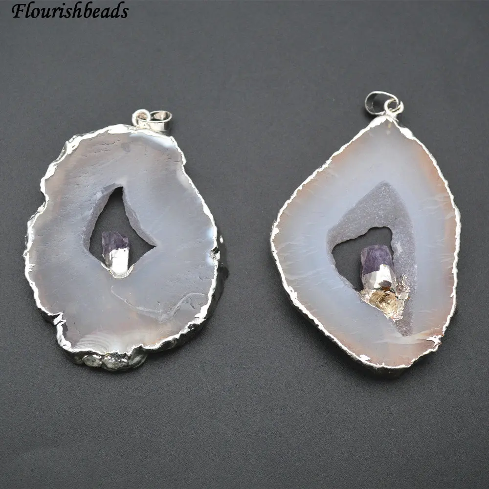 Beste Koop 1 st Grote Size Natuurlijke Geode Druzy Grijs Agaat Slab met Amethist Binnen Overdreven Stone Hanger Fit Ketting Maken Sieraden Goedkoop