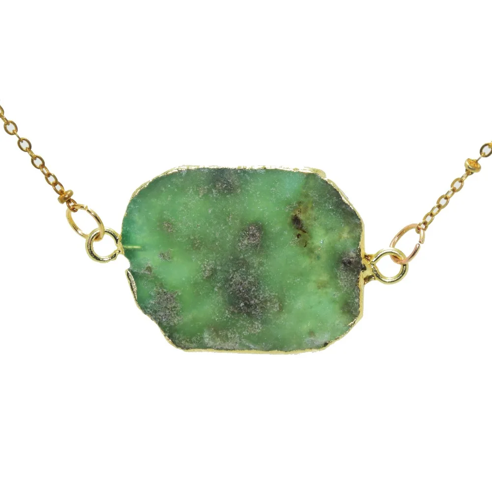 Beste Koop Mode sieraden green crystal quartz Goud Bezel hanger vrouwen ketting natuursteen Ruwe Chrysopraas slab slice ketting Goedkoop