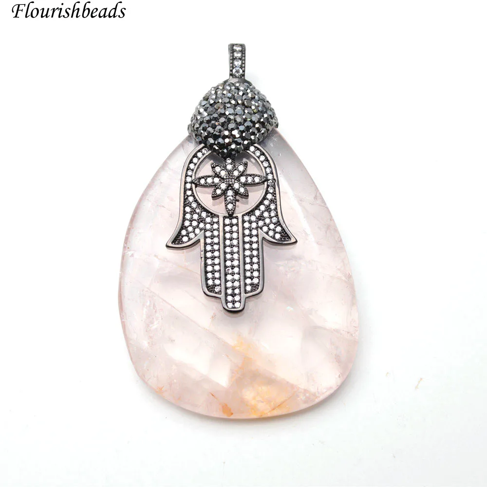 Goede Koop Natuurlijke Rozenkwarts Freeform Slab Verharde CZ Kralen Metalen Hand Charm Hanger Fit Fashion Ketting Maken 3 st per lot Goedkoop