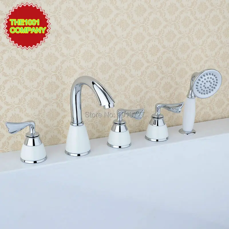 . Kopen Goedkoop Drie Handvatten Curve Tuit Bar Kraan Wijdverspreide Romeinse Bad Badkuip Mengkranen Toilet Sanitair Armaturen met Douche Arm Keramische Prijs.