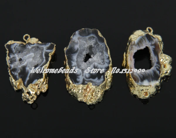 Beste Kopen Hot Designer! 5 stks Natuurlijke Druzy Quartz Ag ate Charms Hangers, Plated Gold Double Loops, Vrijheid Slice Slab Stone Kralen Ketting Goedkoop