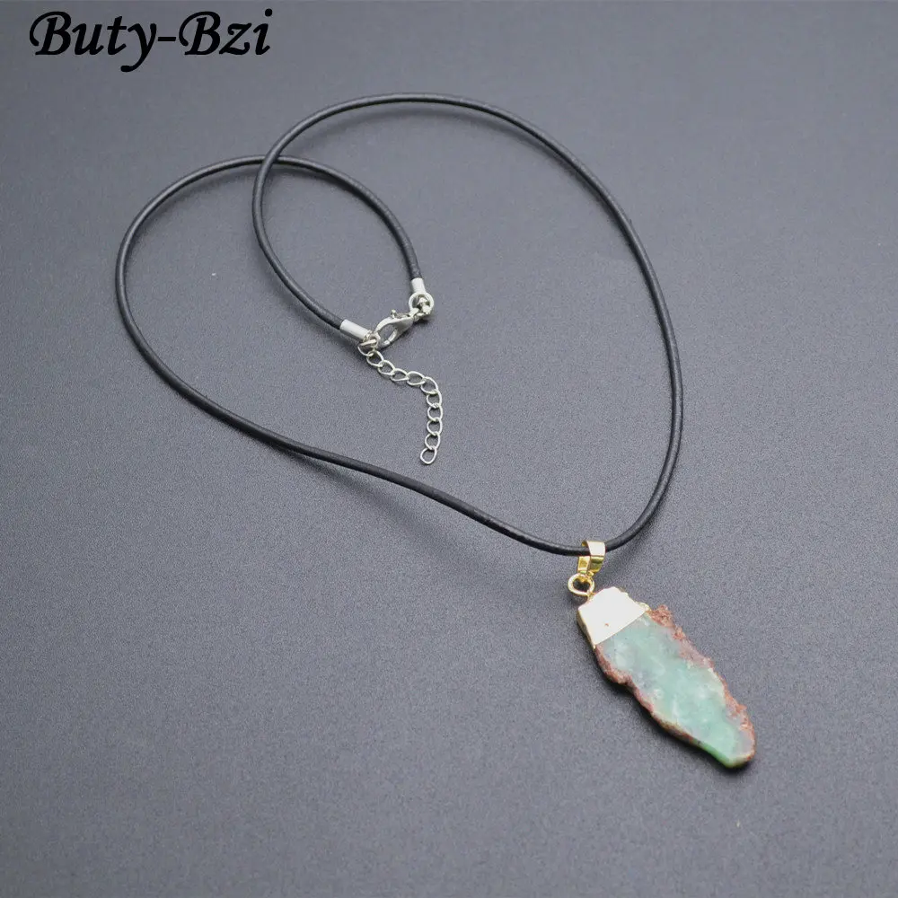 Beste Kopen Unieke Natuurlijke Groene Freeform Slab Strip Hanger Lederen Koord Kettingen Ketting Mode sieraden Goedkoop